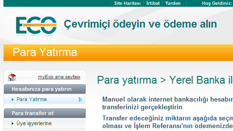 Mail adresinize gönderilen linke tıklayıp hesabını aktifleştirdikten sonra ecocard sitesine giriş yapın ve şu resimde gösterildiği gibi havale yolu ile para yatırma seçeneğini tıklayın;