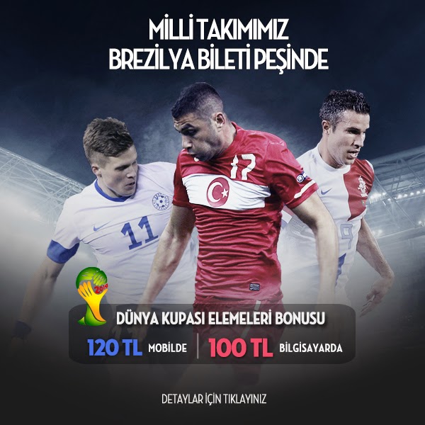 2014 Dünya kupası elemelerine en yüksek oranlar ve en iyi bonus fırsatları yine bets10 dan geldi.İki ayrı periyoatta iki ayrı bonus veren bets10 resmi sitesinden bonusları şu şekilde duyurdu. 1. periyot için 10-11 ekim...